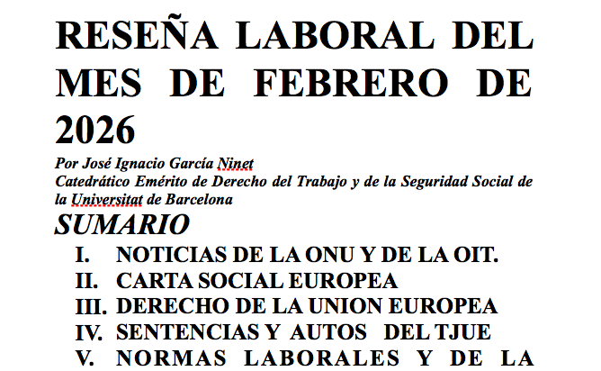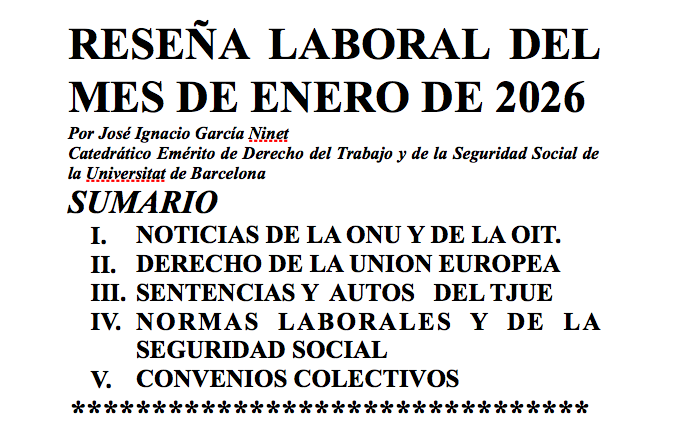 Por José Ignacio García Ninet / Catedrático Emérito de Derecho del Trabajo y de la Seguridad Social de la Universitat de Barcelona Descargar PDF . . SUMARIO NOTICIAS DE LA ONU Y DE LA OIT DERECHO DE LA UNION EUROPEA…
